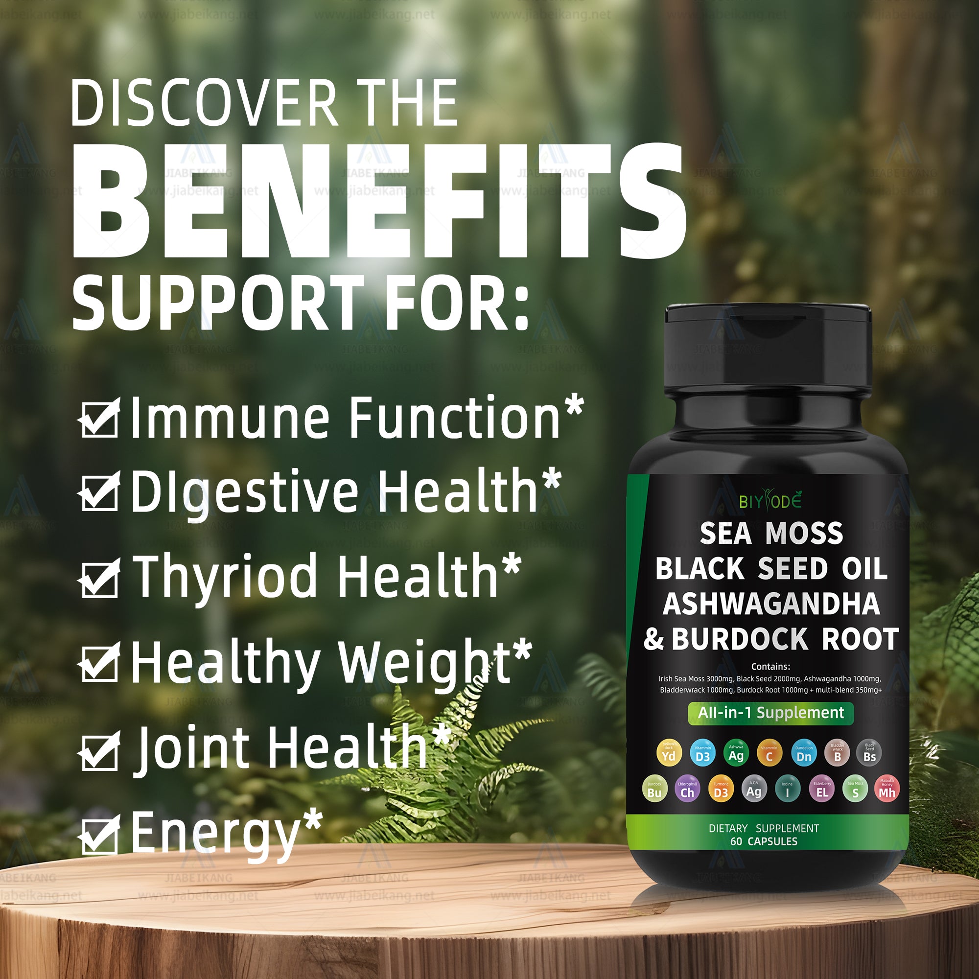 Our advanced formula of Irish Sea Moss Capsules are designed for both women and men. Our Seamoss Pills, enriched with Black Seed Oil for hair health, contain a remarkable blend of 16 beneficial ingredients, including Turmeric Curcumin Capsules, Bladderwrack capsules, Burdock roots, Chlorophyll, Ginger and more. BIYODE presents the world's most comprehensive 16-in-1 Magic Moss formula, featuring raw sea moss, black seed, ashwagandha extract, bladderwrack root, burdock roots, ginger and turmeric capsules.